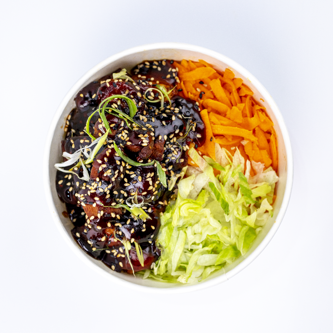 Crispy chicken thigh in an amazing teriyaki sauce topped with lettuce, coleslaw & Korean BBQ spices.