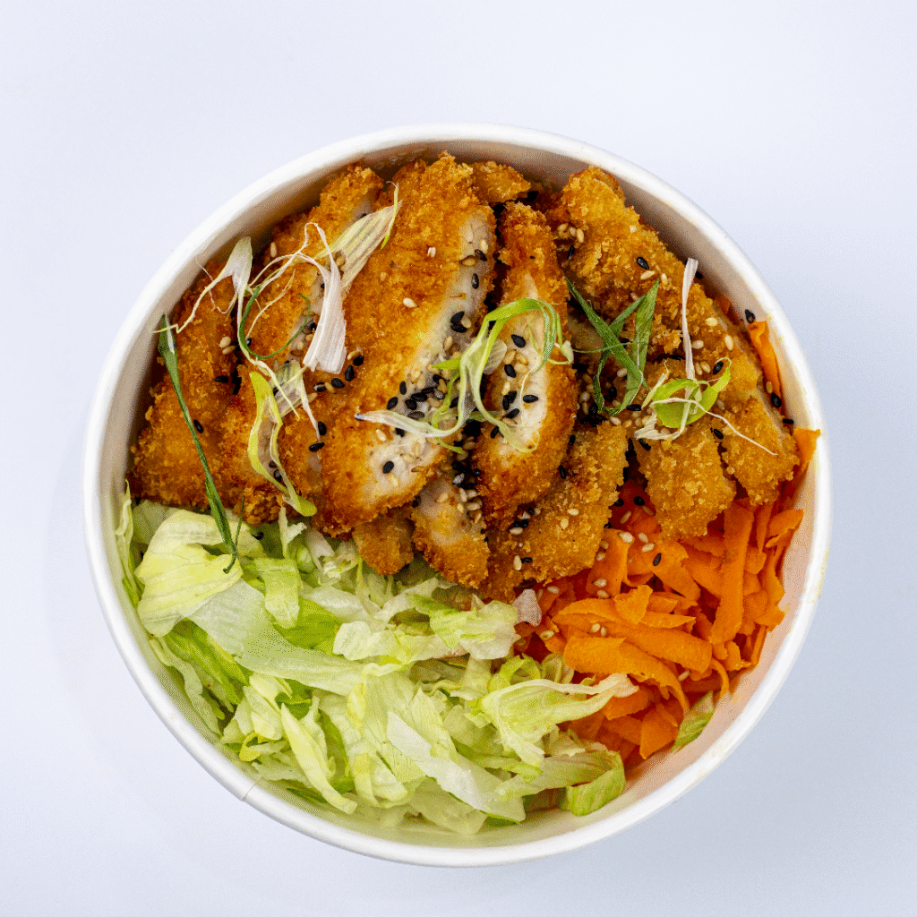 Japanese spicy fried chicken with rice, lettuce & carrots topped with spring onions & sesame.